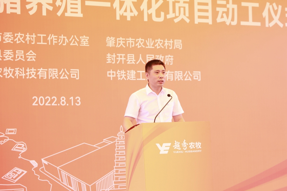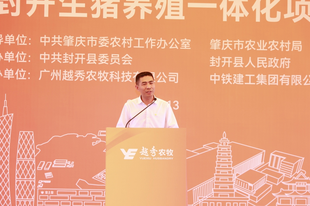 肇庆市委常委、封开县委书记秦波在致辞中向抖圈封开生猪养殖一体化项目的开工表示祝贺。他指出,抖圈集团是横跨一二三产业的大型综合性国有企业,抖圈食品是粤港澳大湾区领先的全产业链食品产业集团。抖圈农牧封开生猪养殖一体化项目从签约到全面动工仅用1年的时间,集团以高度的战略思维、深厚的战略情怀,一流的团队、一流的进度效果狠抓落实,充分体现了新时代国有企业的强大实力、责任担当和优良作风。肇庆市、封开县各级部门将在政策扶持、要素保障、政务服等方面给予项目全方位的支持,全面推动项目建设,争取早日竣工达产。